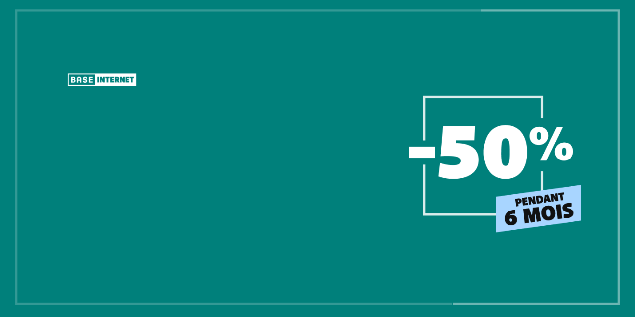 Offre valable du 10/11/2025 au 11/01/2026 inclus, pour toute nouvelle souscription à un abonnement BASE Internet illimité et/ou BASE TV. La réduction de 20 % est appliquée pendant 12 mois sur le prix de l’abonnement mensuel. Offre non valable sur BASE Internet limité ni sur les options payantes.